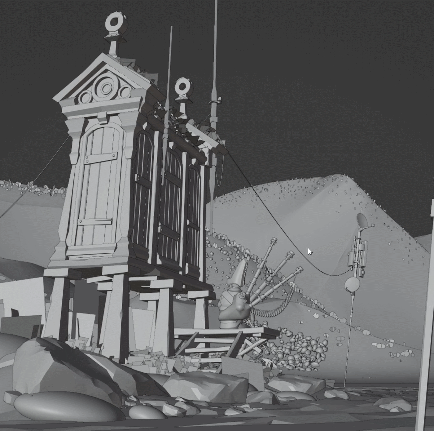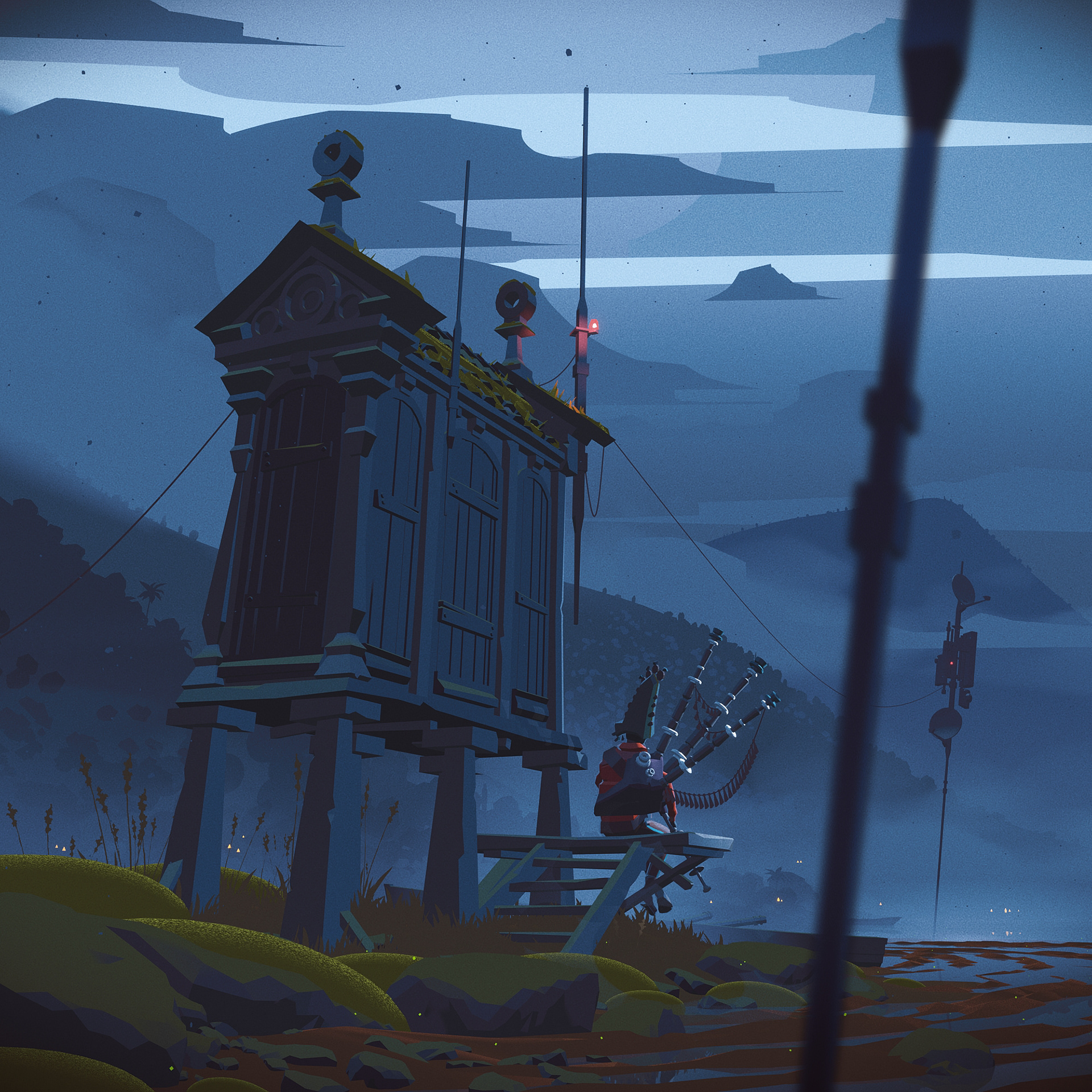 The sun dips low, partially veiled by hilltops and heavy clouds. A sleepy lagoon, scattered with shallow ponds, slowly dissolves into the mist. From somewhere in the distance, the haunting sound of bagpipes echoes across the landscape.
